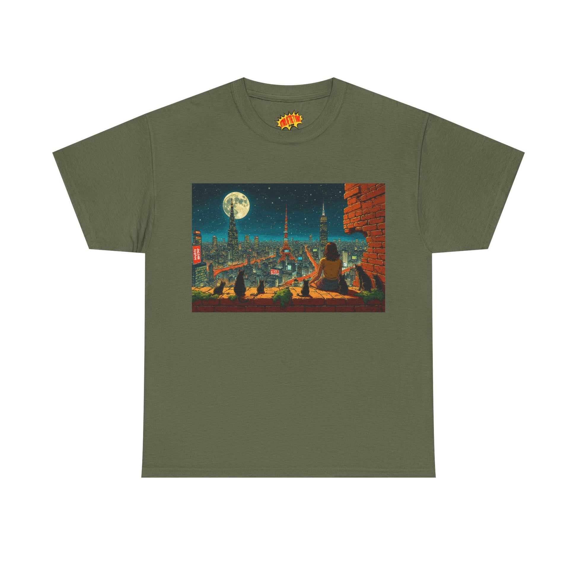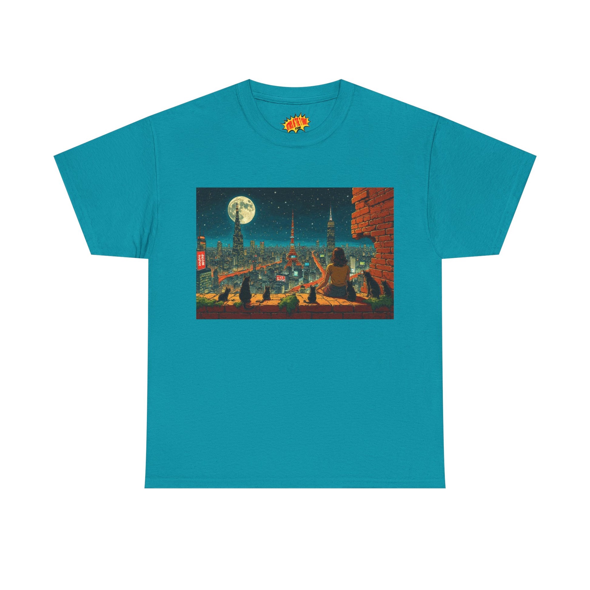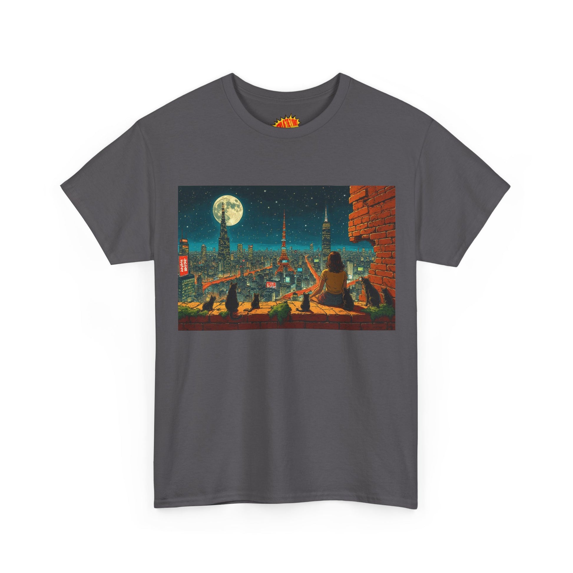 Anime Cityscape Full Moon Scene w/Girl & Cats T-Shirt *Multiple Colors*