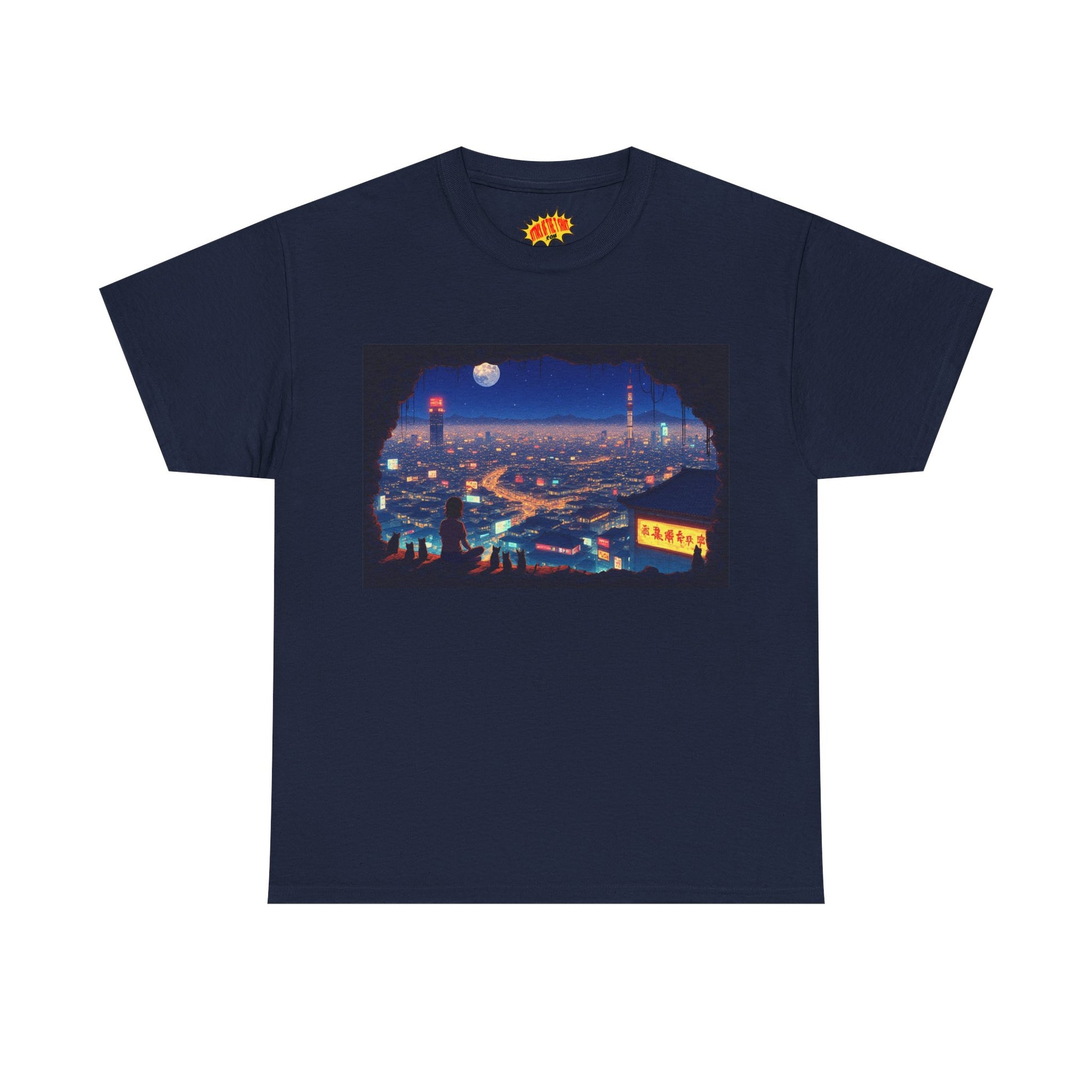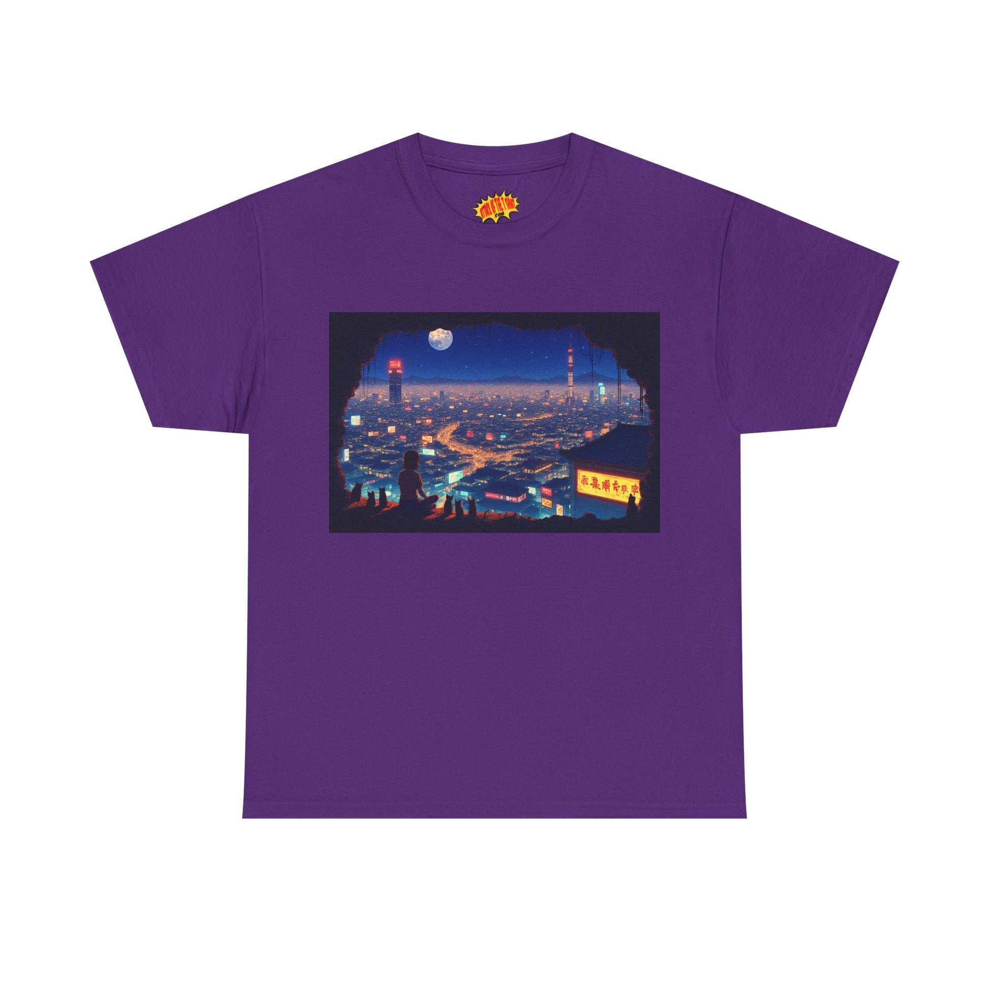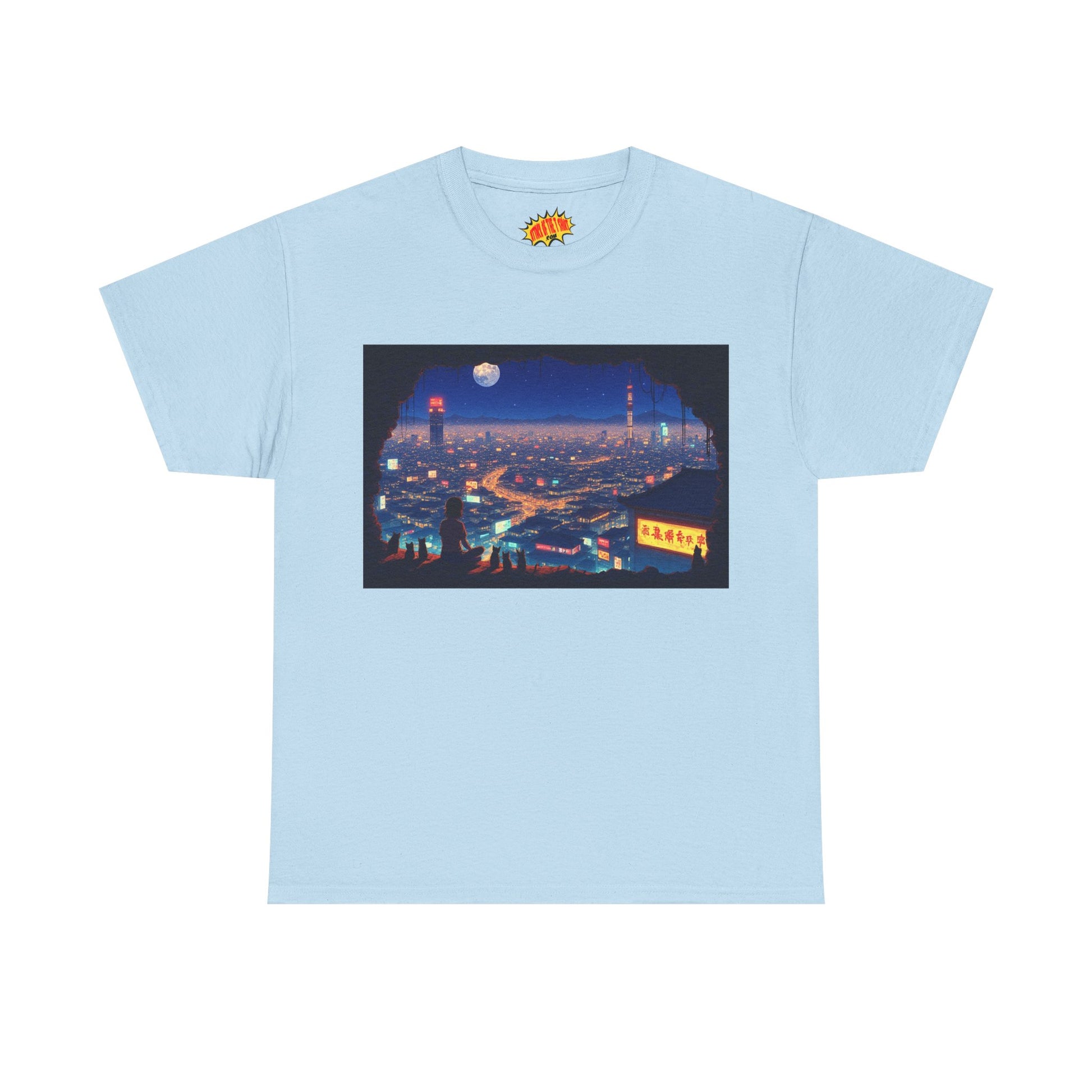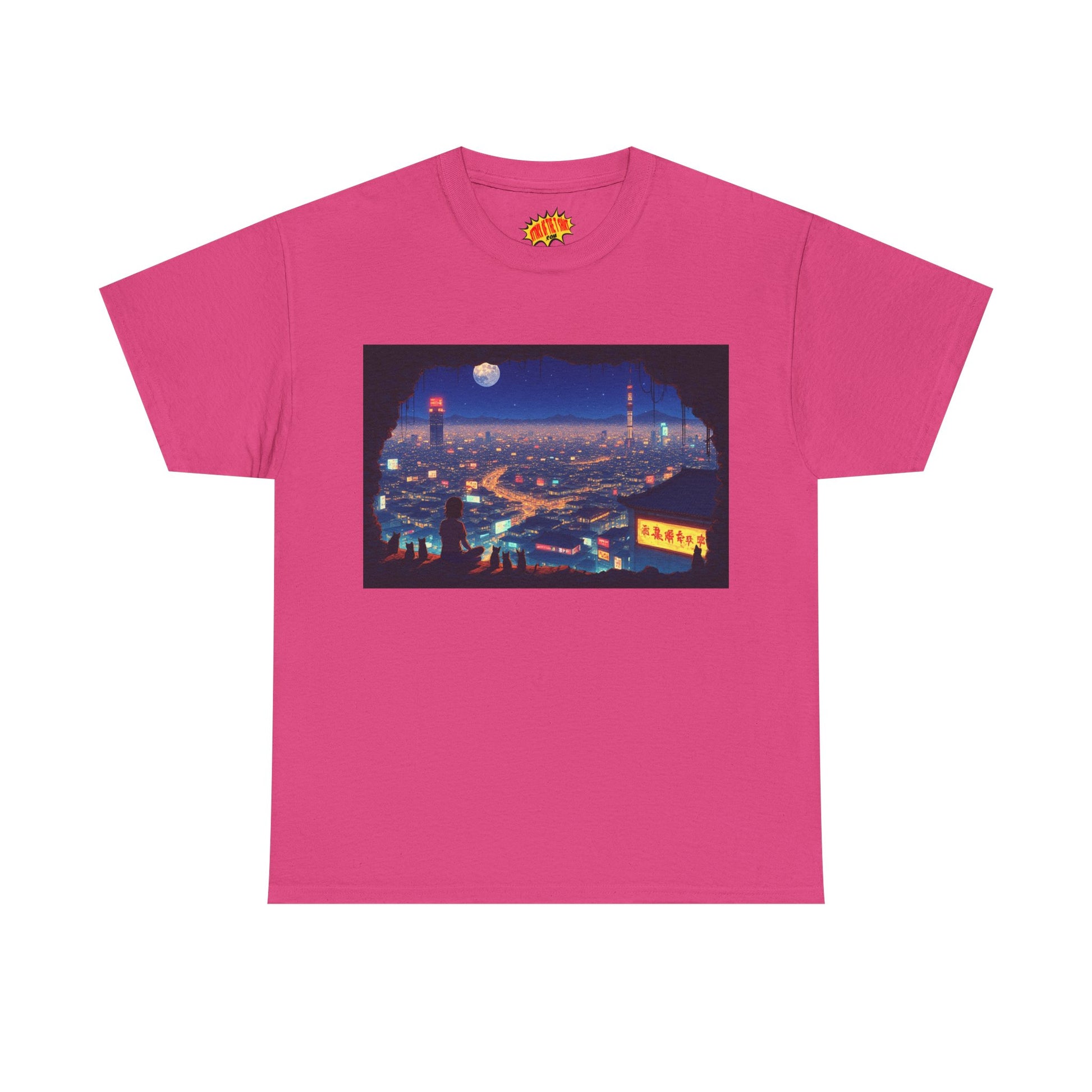 Anime Neon Cityscape Scene w/Girl & Cats T-Shirt *Multiple Colors*