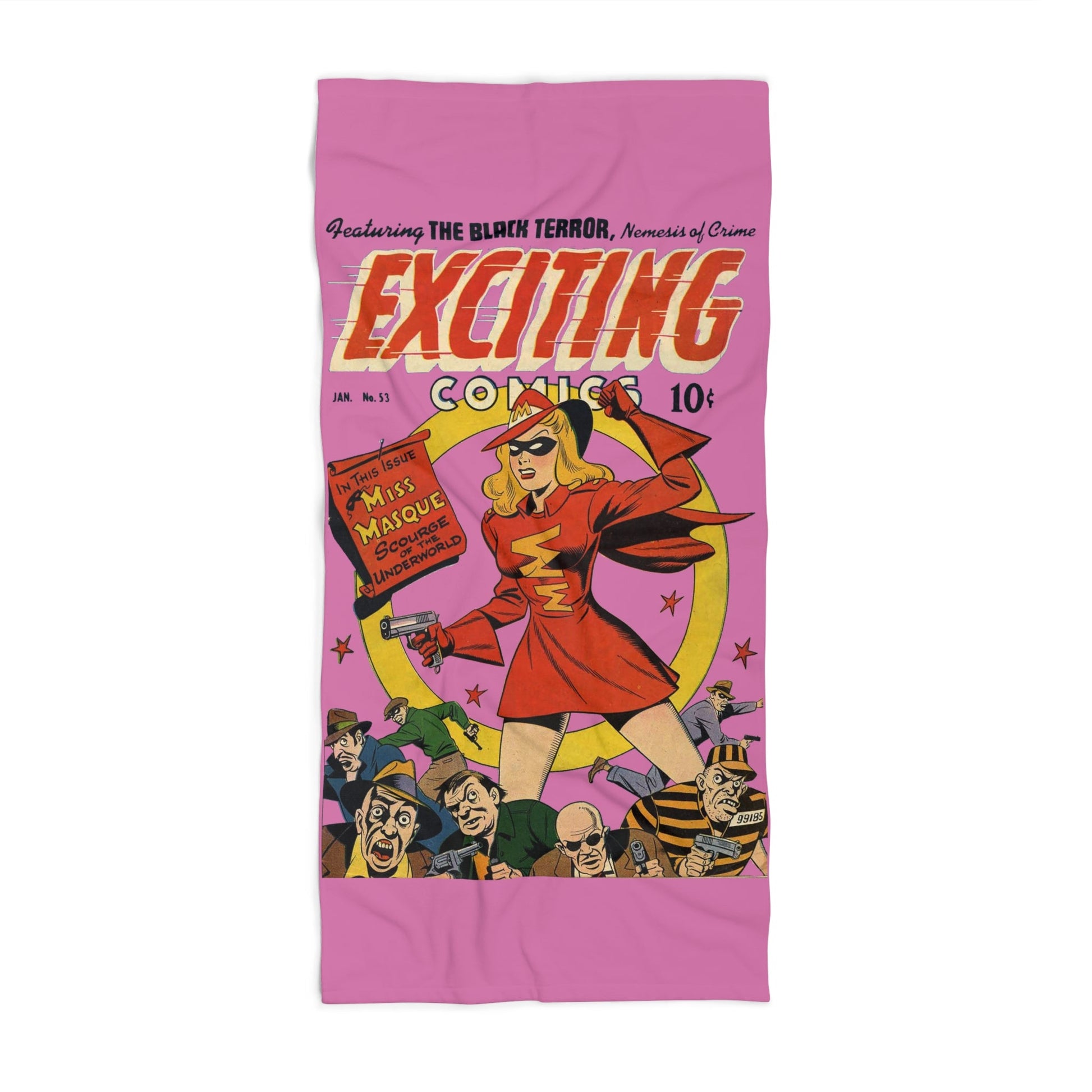 Exciting Comics #53 beach towel featuring Miss Masque, scourge of the underworld. Pink Background.