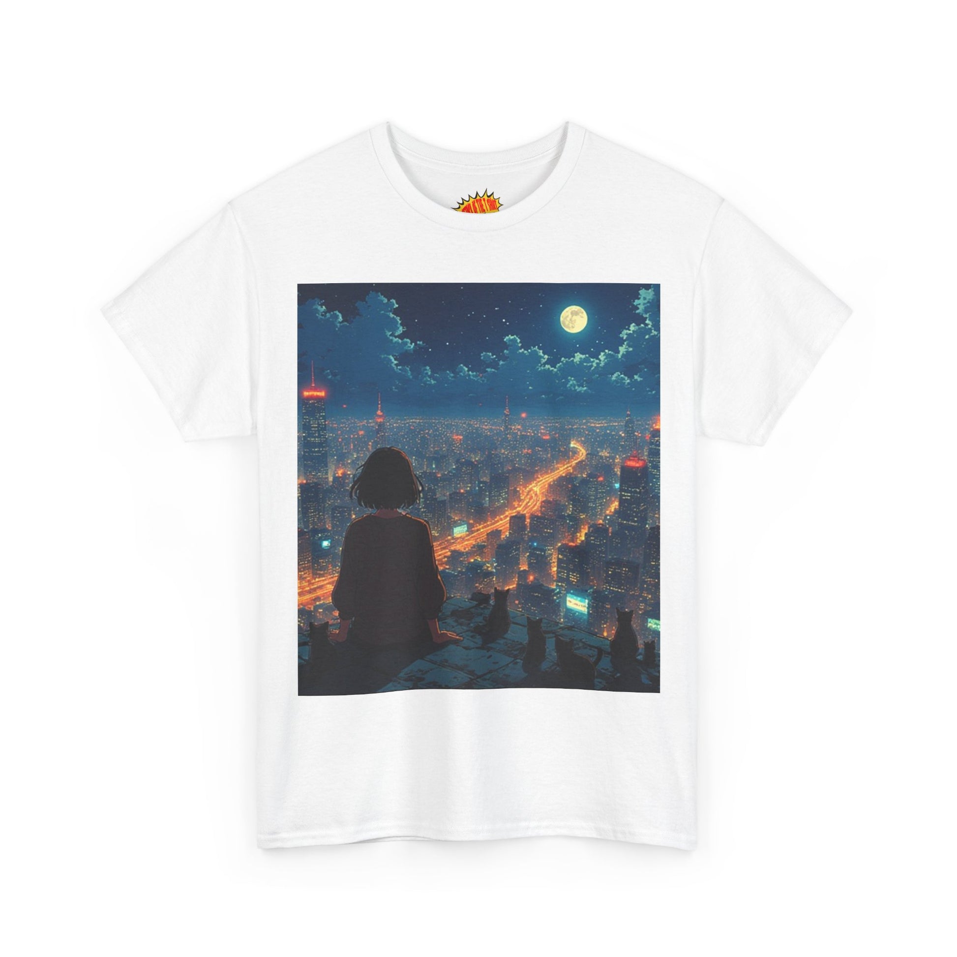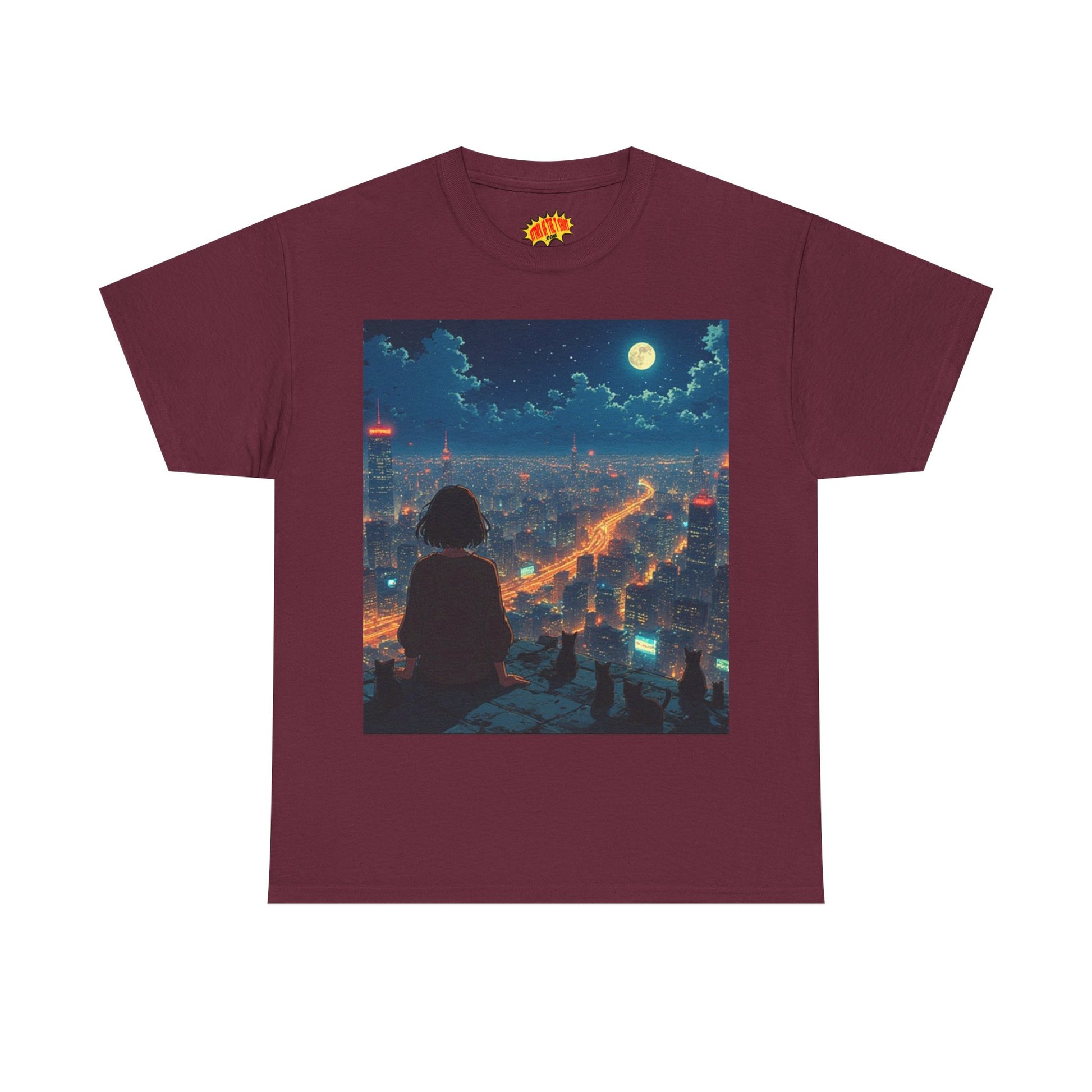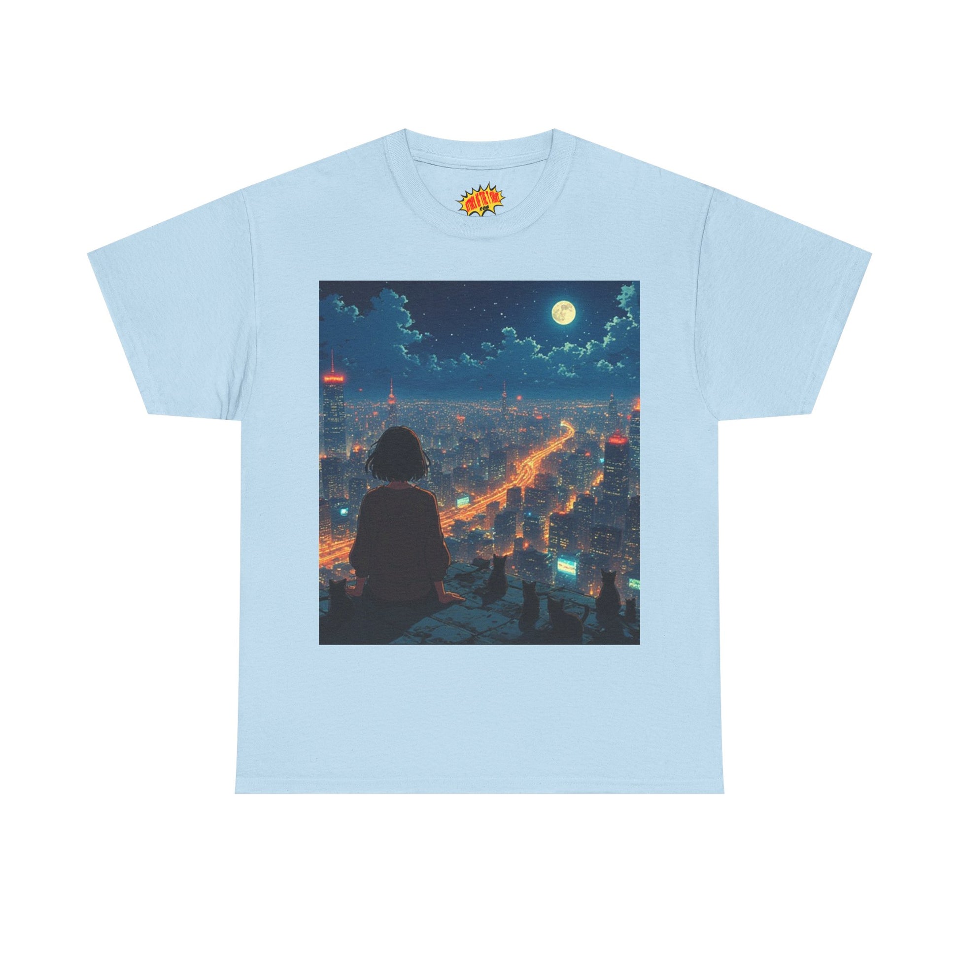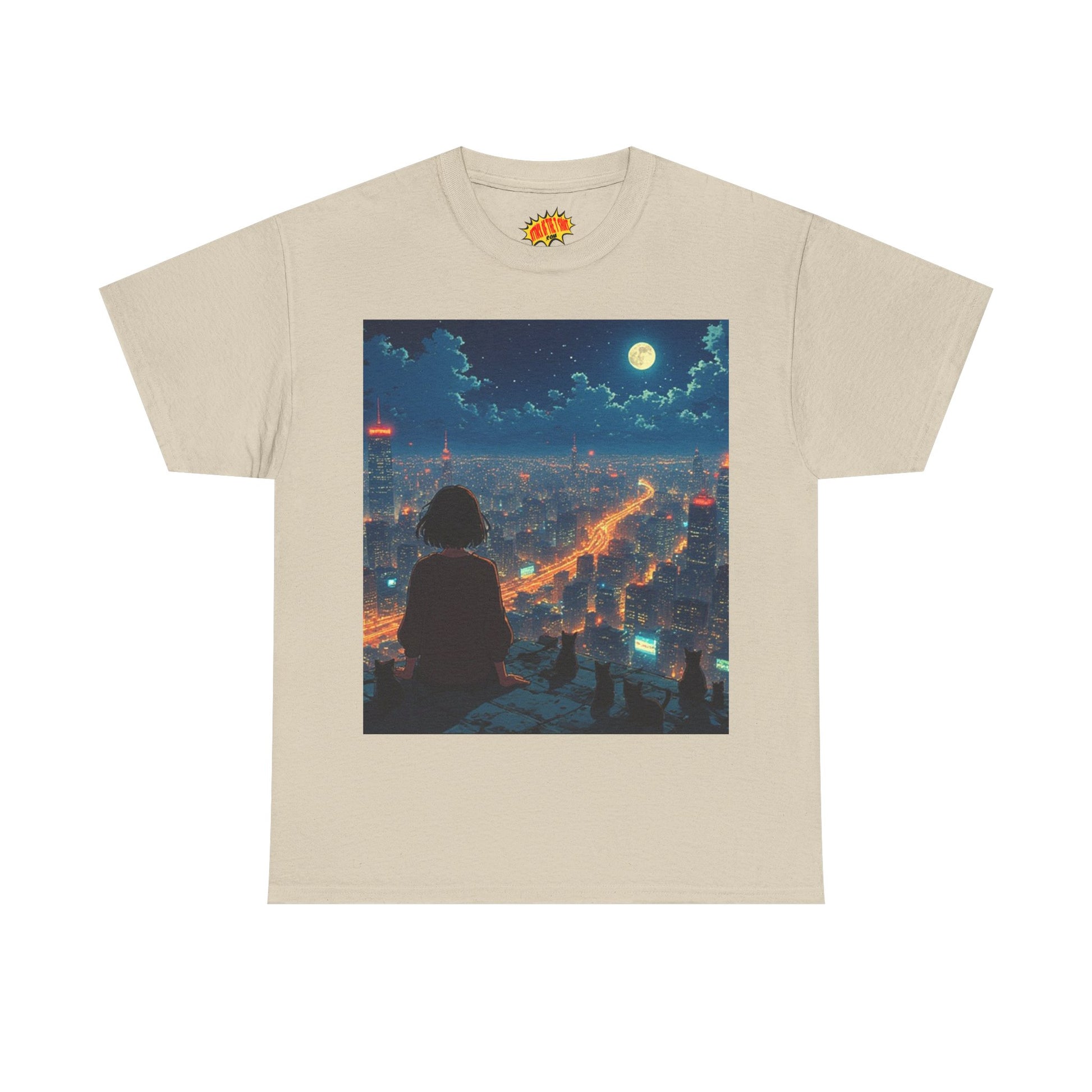 Neon City Anime Night Scene w/Girl & Cats T-Shirt *Multiple Colors*