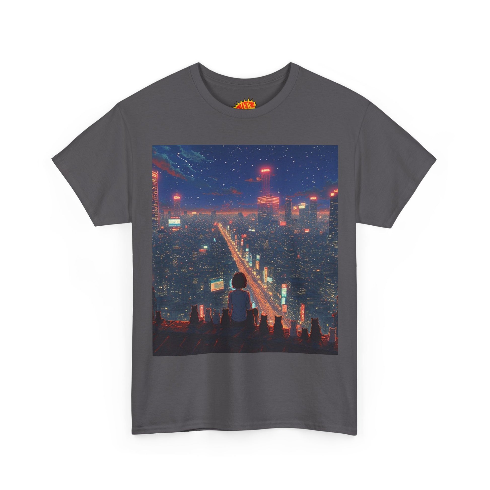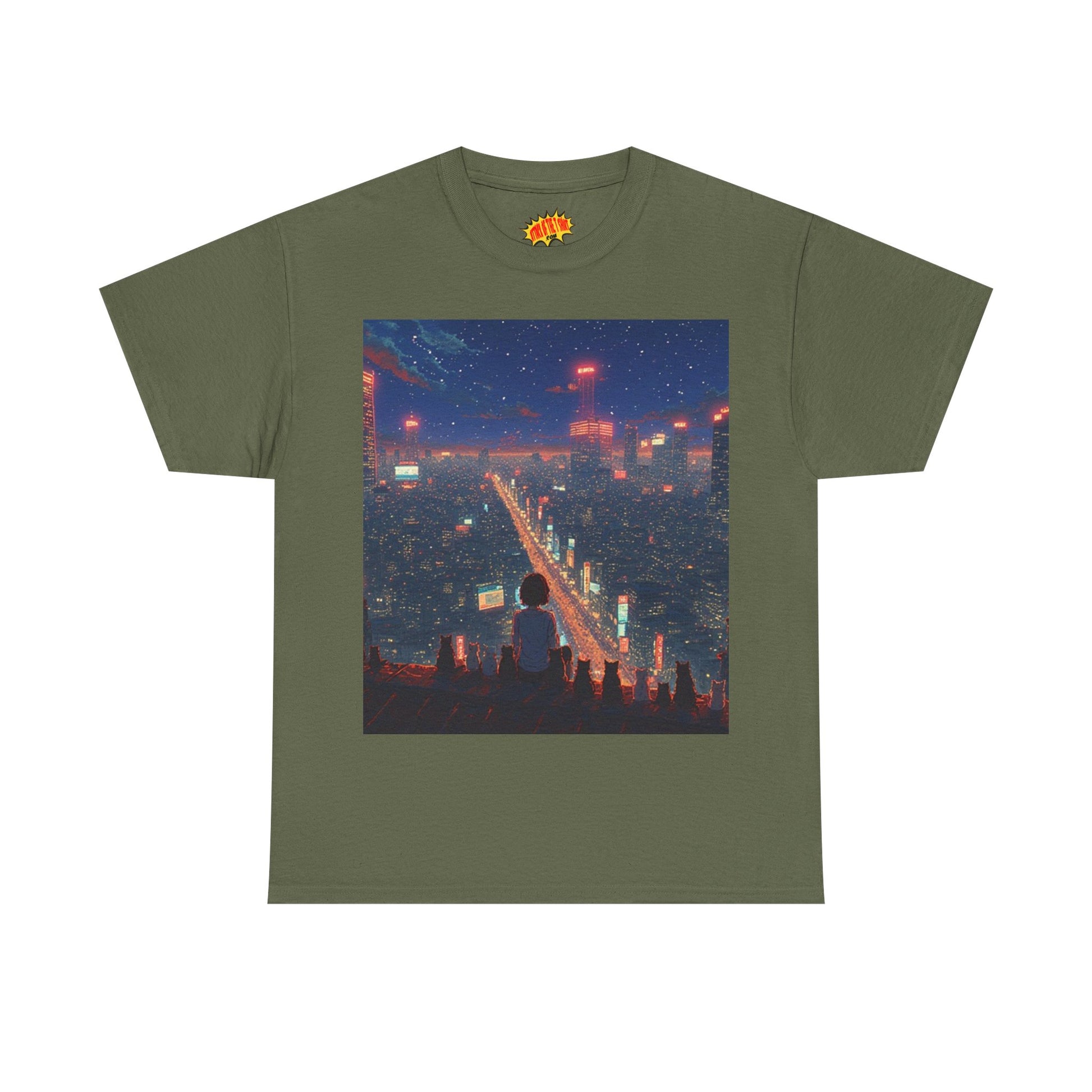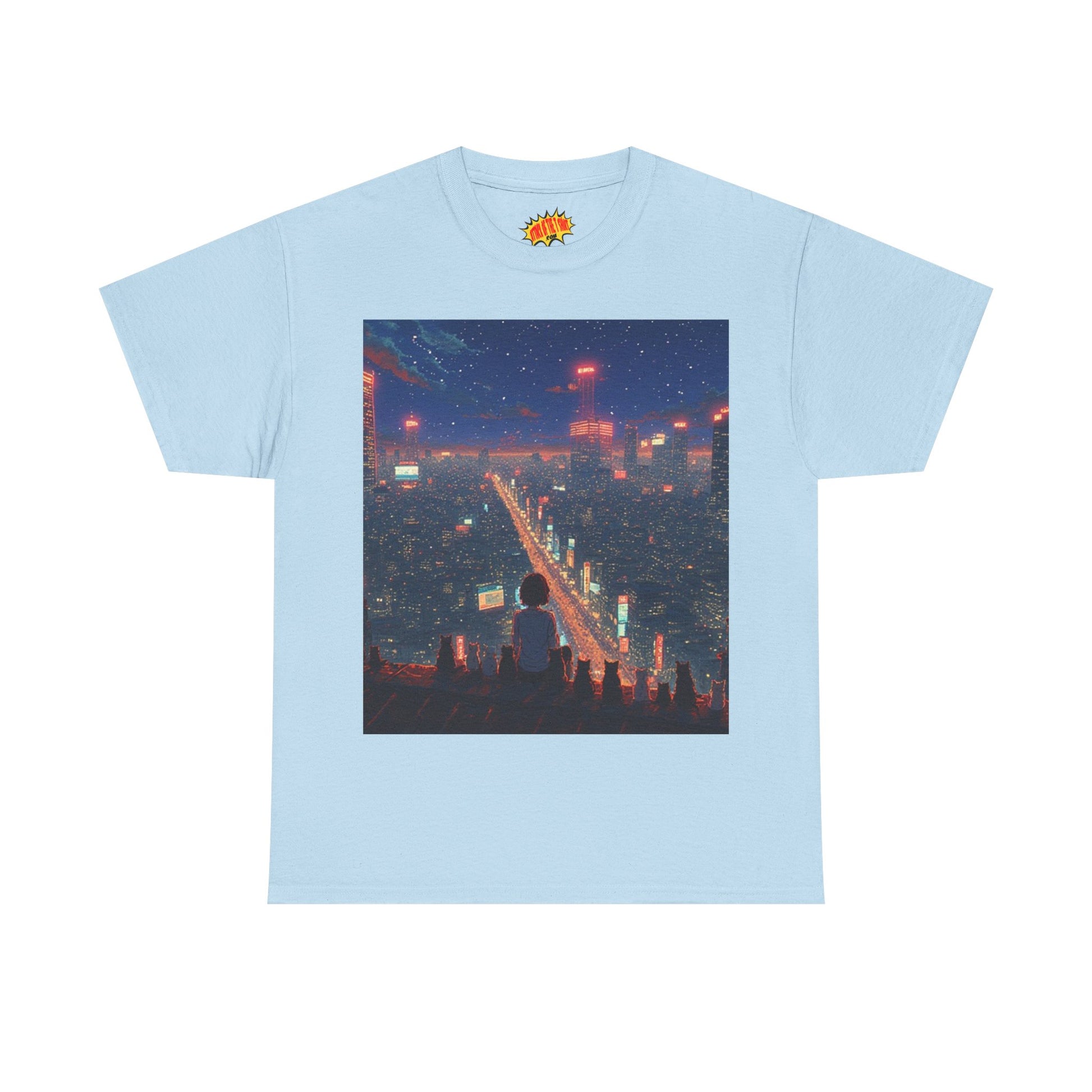 Nighttime Neon Anime City Scene w/Girl & Cats T-Shirt *Multiple Colors*