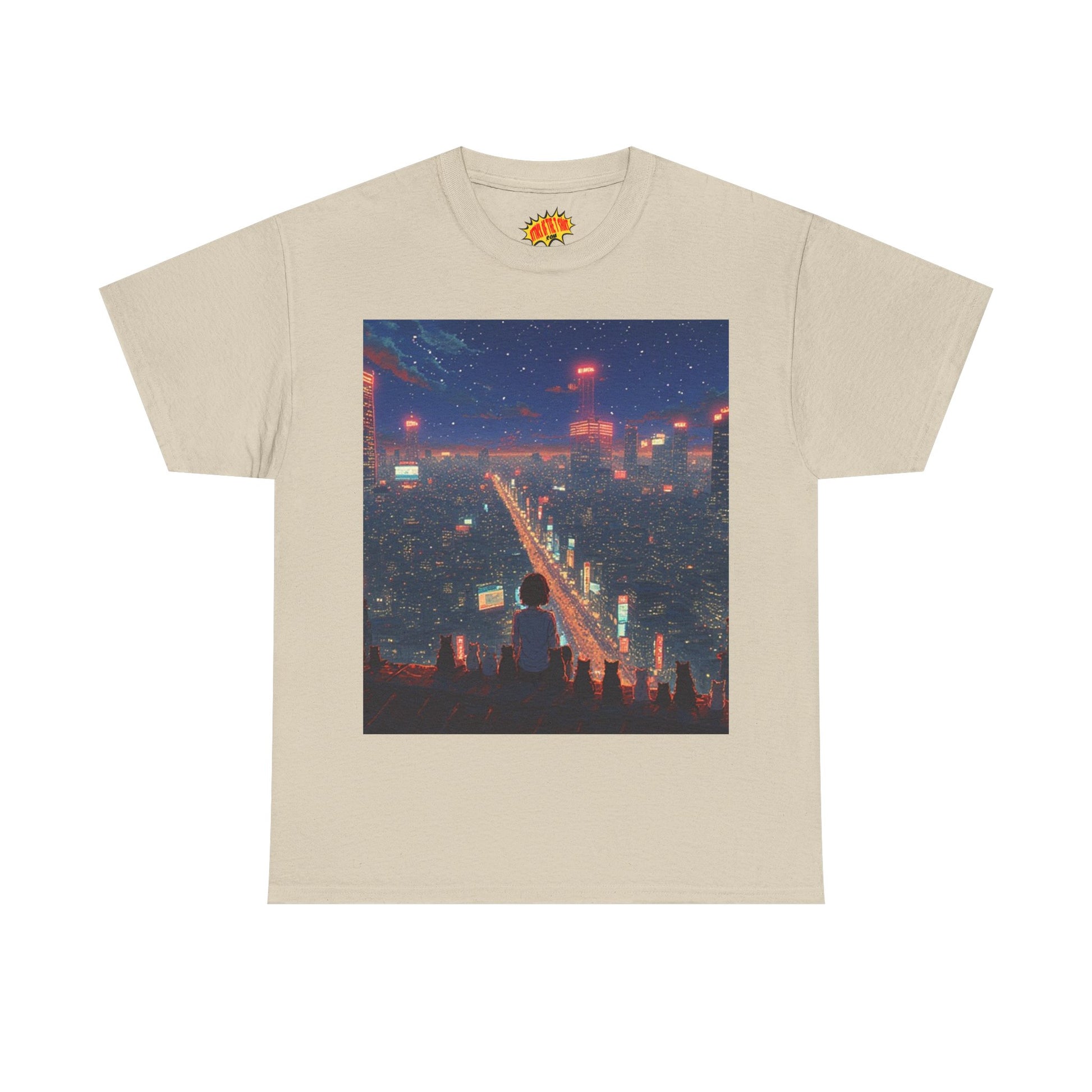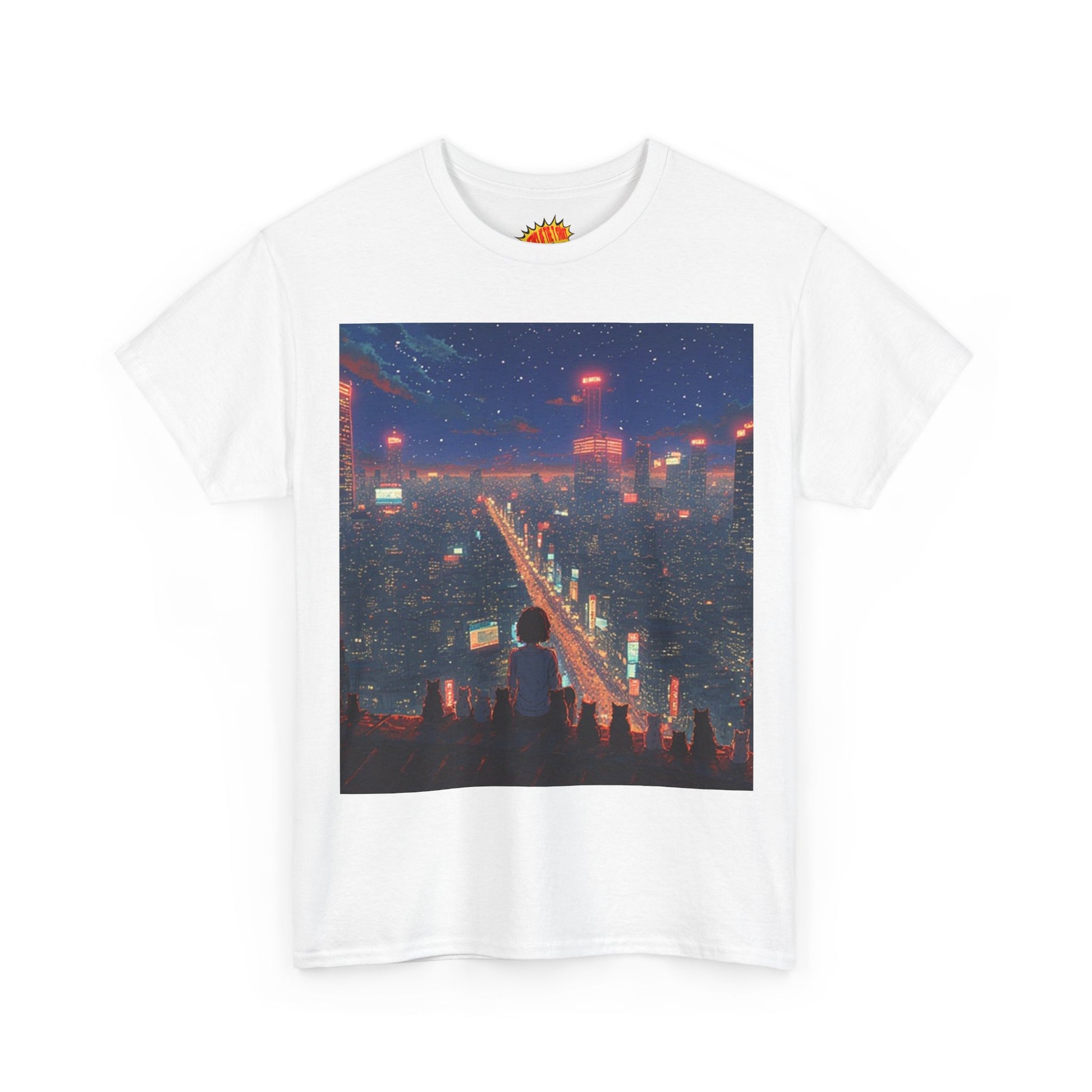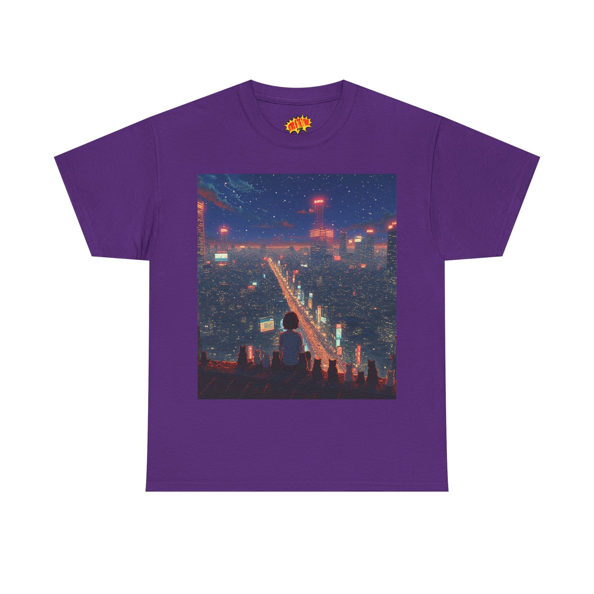 Nighttime Neon Anime City Scene w/Girl & Cats T-Shirt *Multiple Colors*